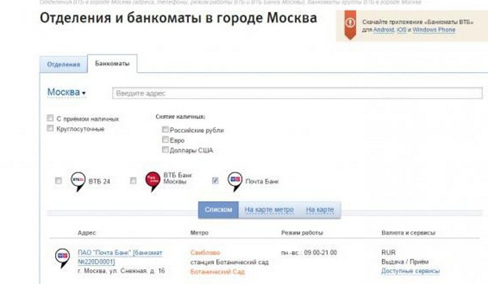 Ниже пример терминала Банка Москвы. Аппараты этой организации можно посмотреть на сайте ВТБ, в разделе «Отделения и банкоматы». Местоположение клиента определяется автоматически.