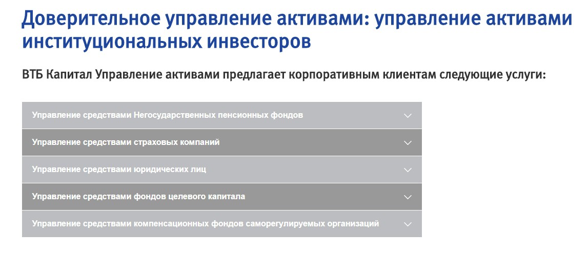 Для негосударственных пенсионных фондов ВТБ предлагает управление пенсионными накоплениями, резервами и личными средствами фондов. При этом будет разработана индивидуальная стратегия действия, обозначен срок работы средств, обозначены виды отчетов и сроки их предоставления. Все это не выходит за рамки Российского законодательства и работает исключительно в интересах клиентов.