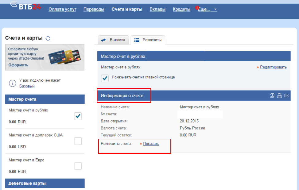 Для того чтобы узнать реквизиты своей карты, нужно зайти в личный кабинет ВТБ-онлайн и выбрать раздел "Мои продукты", далее - "Счета и карты" и затем - "Реквизиты".