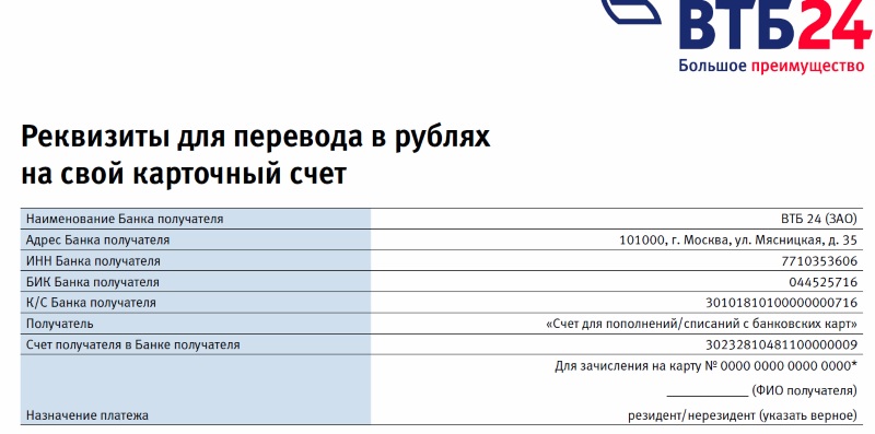 - получатель средств: ФИО латинскими буквами и 20-значный номер счета в ВТБ (ПАО).