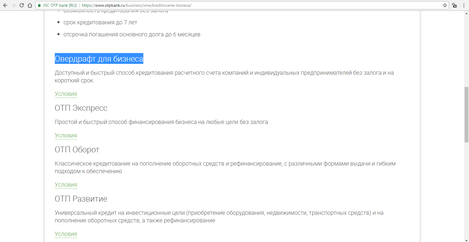 Ниже будет список возможного кредитования. Найдите надпись «Овердрафт для бизнеса».