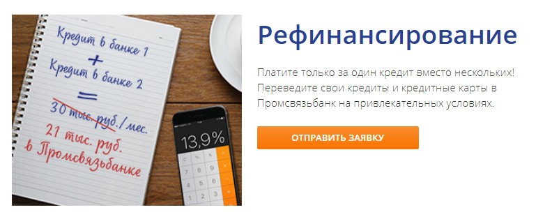 Таким образом, рефинансирование — это очень полезная услуга, которая позволяет значительно сократить расходы по обслуживанию кредита. Промсвязьбанк предлагает своим клиентам выгодные условия и низкие ставки.