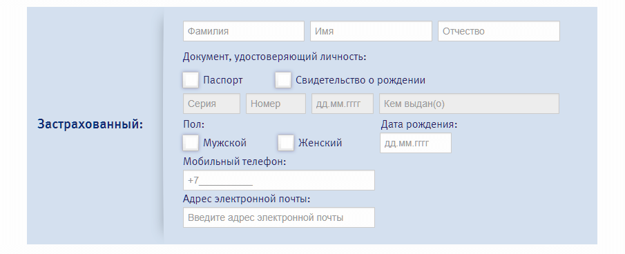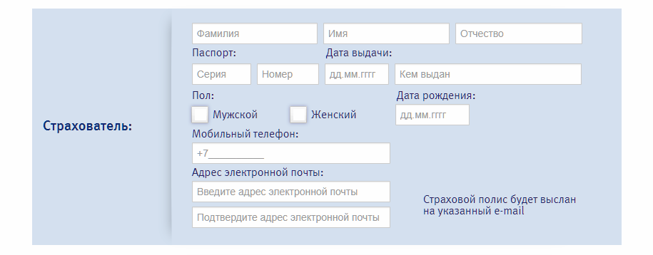 - данные страхователя: фамилию, имя и отчество, дата рождения, контактный номер телефона и адрес электронной почты. Страхователем может быть любой человек;