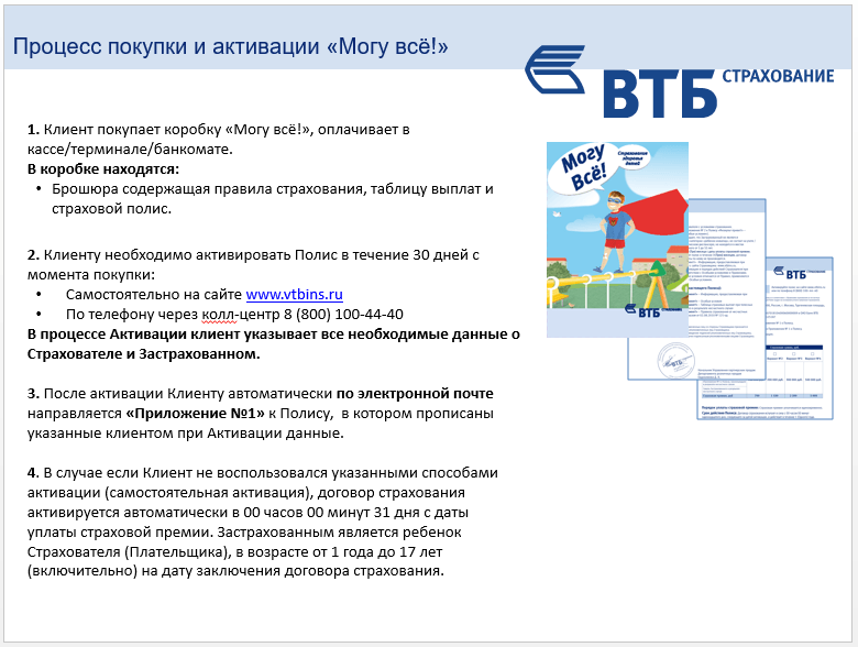 После приобретения самое главное действие - это активация страхования, внесение полиса в общую систему страховой компании ВТБ. После этого застрахованный уже имеет право требовать от компании все необходимые действия, указанные в полисе. Но не стоит забывать о начале срока действия, который так же указан в договоре: до его начала все признается недействительным и выплатам не подлежит.