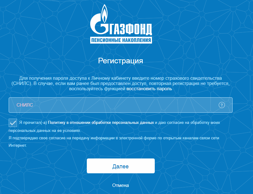 Зарегистрироваться можно, являясь клиентом фонда: для этого необходимо нажать на кнопку «Регистрация», ввести данные номера СНИЛС и дождаться окончания обработки информации системой. После этого на номер придет индивидуальный, сгенерированный автоматически пароль, который впоследствии можно сменить в настройках личного кабинета.