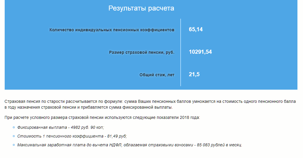 После нажатия на кнопку «Рассчитать» система автоматически подсчитает баллы и приблизительную сумму ежемесячной пенсионной выплаты. Ниже указаны формулы, которые используются в официальных расчетах при выплатах 2019 года. Следует помнить, что эти данные являются приблизительными, меняются при смене данных в калькуляторе и это не означает, что при выходе на пенсию суммы будут совпадать.
