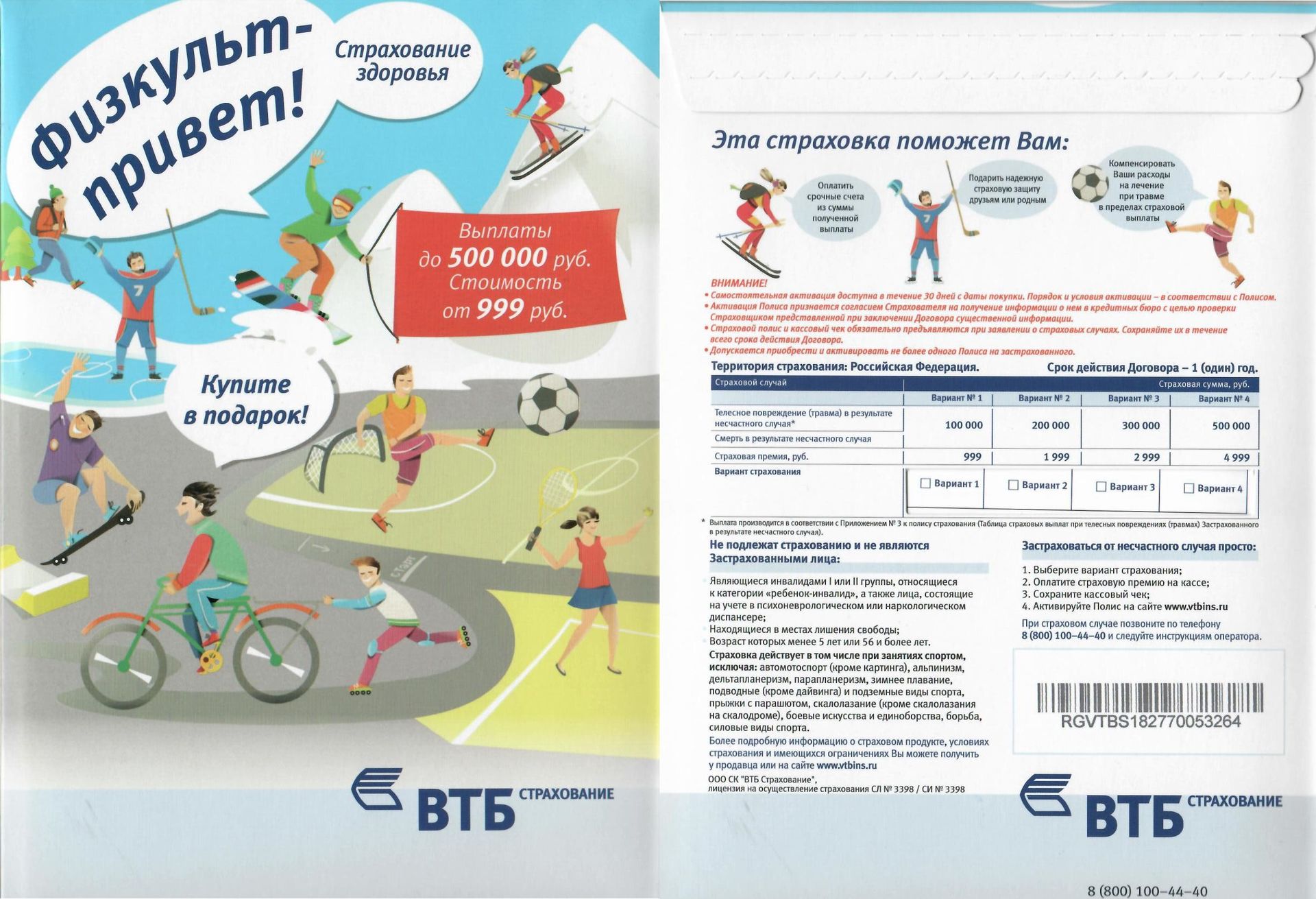 "Физкульт-привет" от ВТБ защищает от рисков телесного повреждения и смерти. Как правило, такой полис оформляют спортсмены в возрасте от 5 до 55 лет. Срок действия - 1 год.