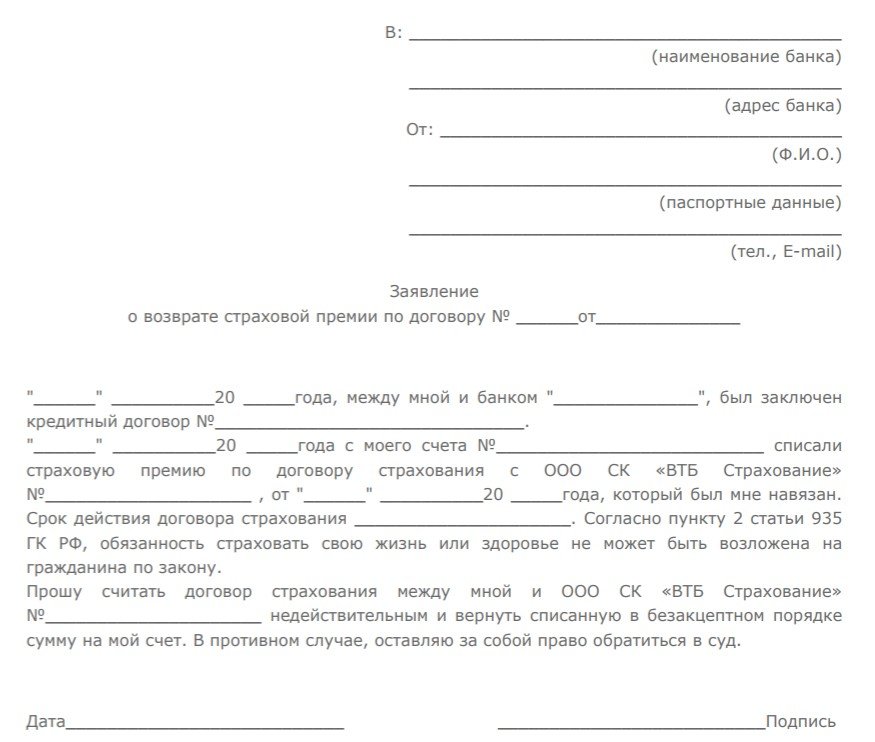 Для того чтобы возвратить страховку, расторгнуть договор и вернуть деньги , нужно заполнить заявление по форме банка, образец: