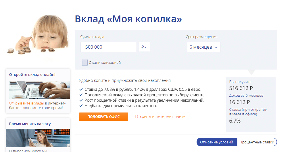 | Максимум возможностей | 0.073 | 150 000 рублей | Можно снимать деньги в любой момент, а также пополнять вклад |