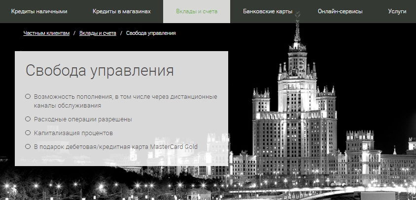 - Минимальная депозитная сумма: 1,5 милилонов рублей или 50 тысяч долларов США.