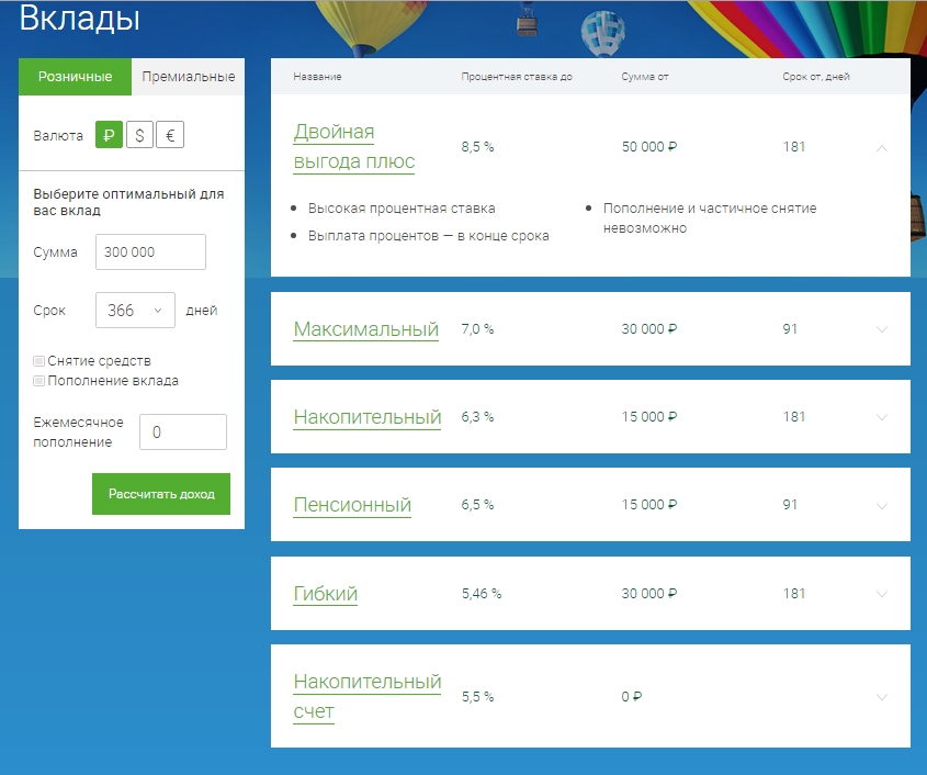 Программа премиального вклада «Стабильный доход» включает в себя такие условия: