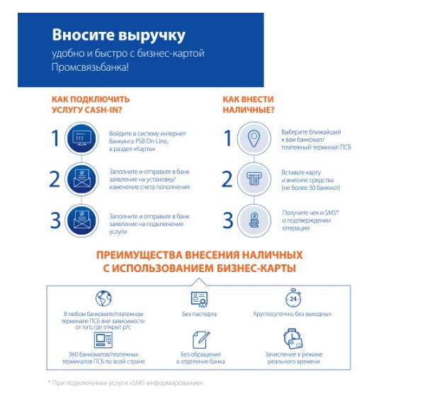 - Внесение выручки на карту в режиме 24/7 через банкомат, оборудованный функцией cash-in.